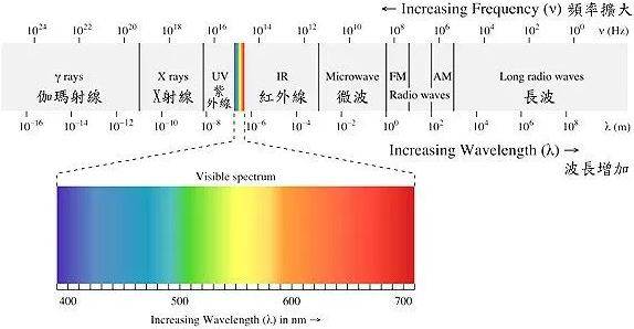整個電磁波譜包括了無線電波、紅外線、紫外線以及X射線等。它們的波長不同,其中波長在400~760納米之間就是一般的可見光。