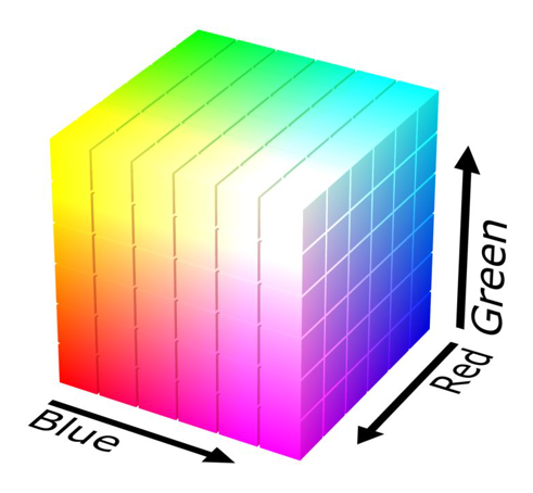 我們可以用一個立方體來表示RGB色彩模型,因為我們剛才說了任意一種色彩都可以被拆分為R、G、B三個分量,同理,立方體中的任意一個點的位置坐標也可以拆分為X、Y、Z三個分量,因此我們就可以利用立方體里面的某個點來表示某種顏色。