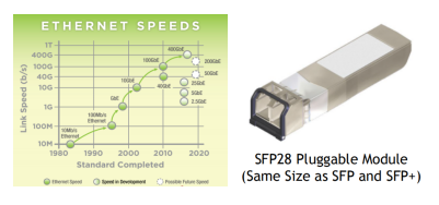 25GigE SFP28接口提供了三個(gè)選項(xiàng),可以滿足所有應(yīng)用的電纜長度要求。第一種選擇是使用SFP28多模光纖模塊/收發(fā)器和LC-LC多模光纖電纜,電纜長度從1M到70M。第二種選擇使用SFP28單模光纖模塊/收發(fā)器和LC-LC單模光纖電纜,電纜長度范圍從1M到10KM。第三種選擇是使用低成本直接連接來連接1至5米之間的電纜。相比于CXP連接器,25 GigE的連接器碩大無比。